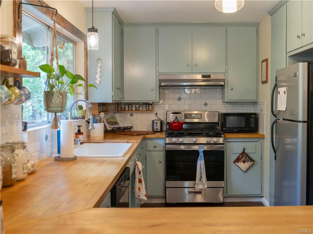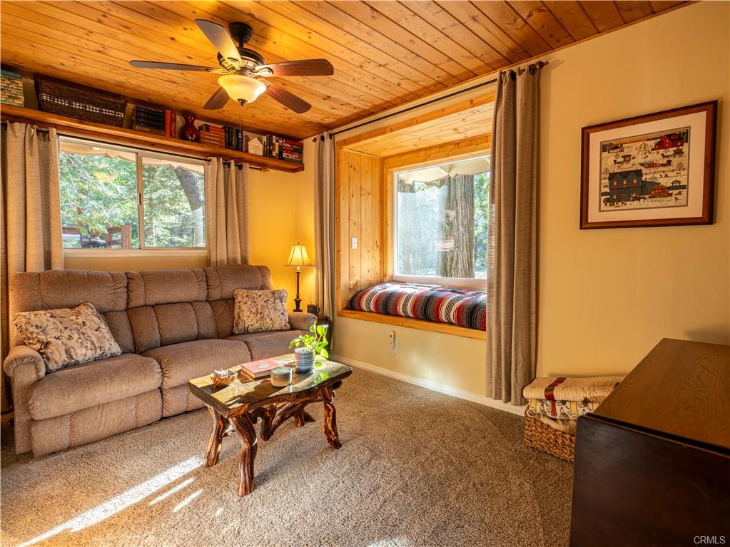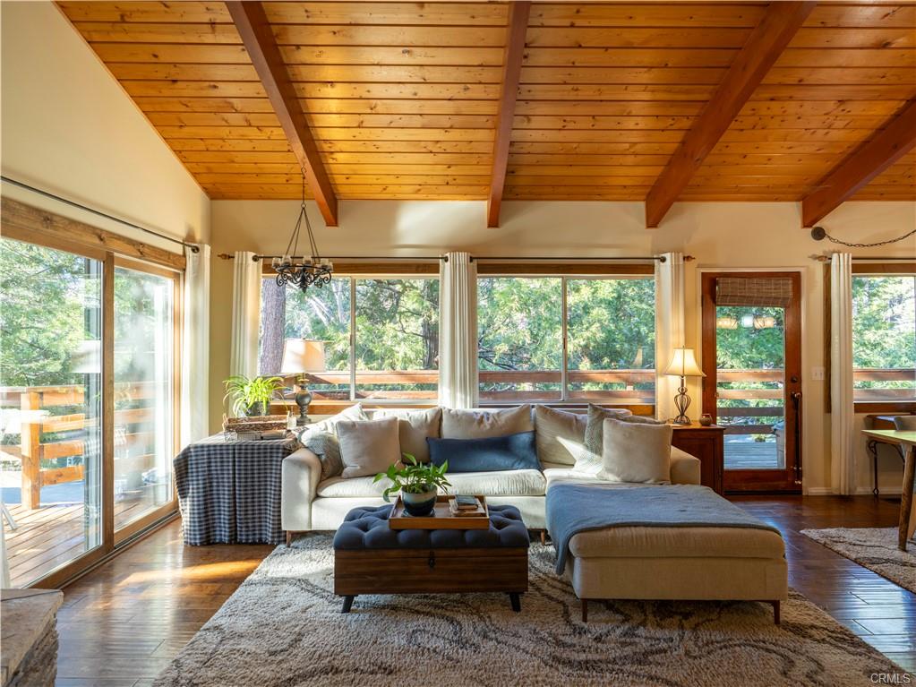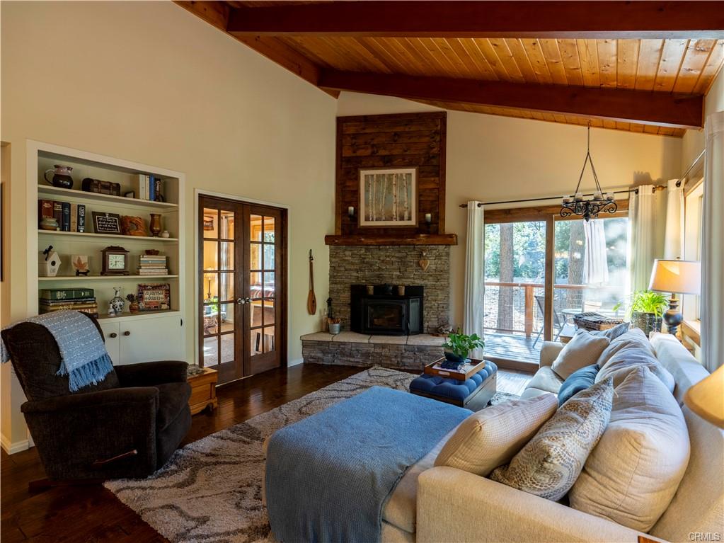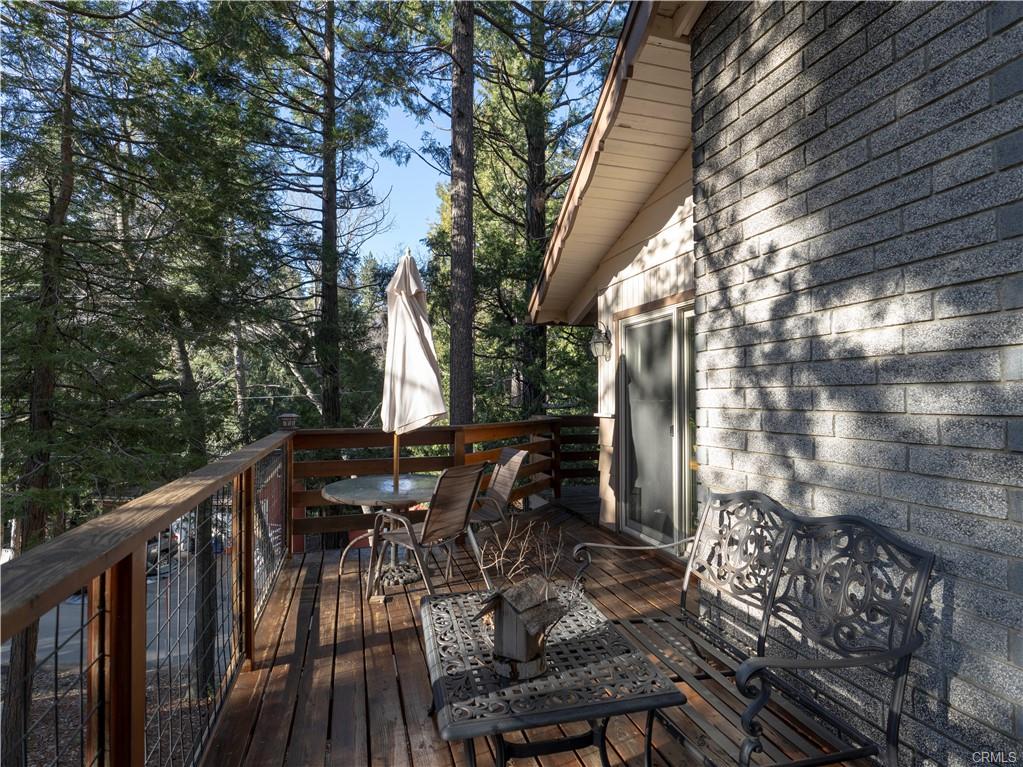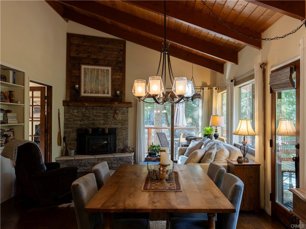 As you walk in the home, there's a hallway area for you to drop off your shoes, hats and coats. At the end of the hallway the home opens up to the living area and the kitchen. The kitchen is fully equipped and has a breakfast bar that opens up to the living room. Between the kitchen and the living room is a dining area. Open beamed ceiling too! The living room has a slate faced fireplace with a wood stove insert to add extra warmth in the chilly winter days. On the front of the home just off the dining room and living room is a large wraparound deck. Another great place to enjoy the mountain air!